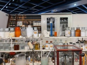 Grinten, biedt het museum een nagebouwde apotheek en een honderdjarig blauwdruk lichtraam.